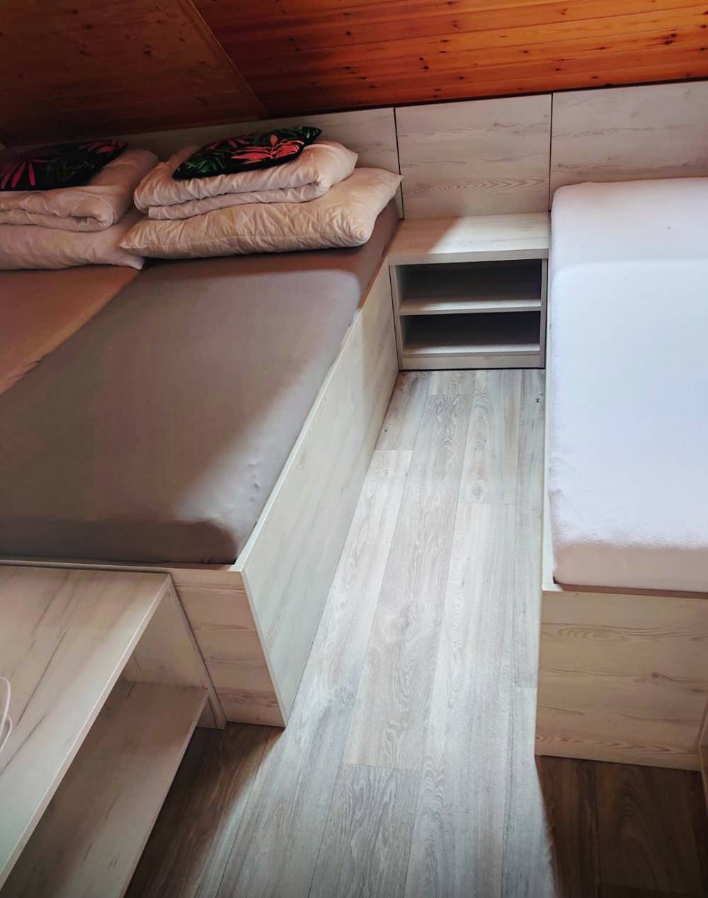 s vlastním vchodem (z levé strany) disponuje terasou s posezením. K dispozici je ložnice s dvěma lůžky, obývák s dalšími dvěma lůžky a kuchyňkou a vlastní koupelna s WC.