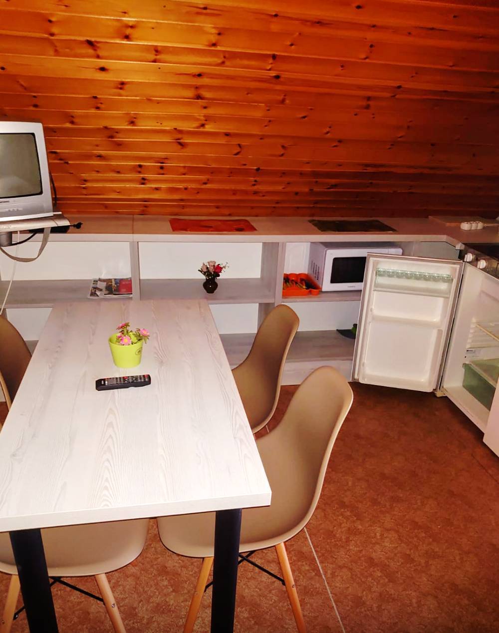 Chata má dva apartmány, každý má vlastní kuchyň: lednice, mikrovlnná trouba, varná konvice, el. vařič.